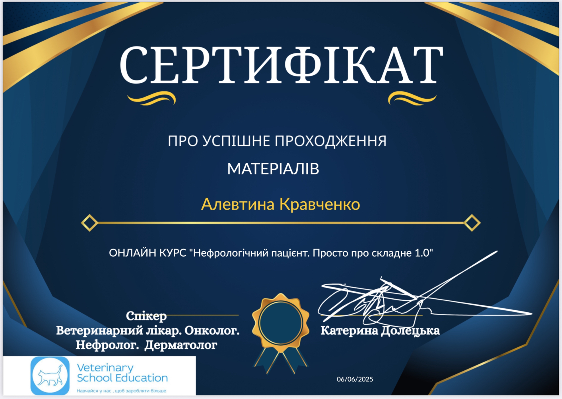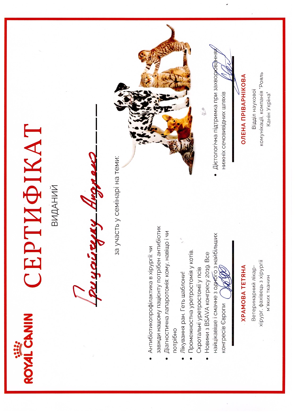 Участник семинара: Специальные диеты при хронических заболеваниях кошек и собак. 2014 г